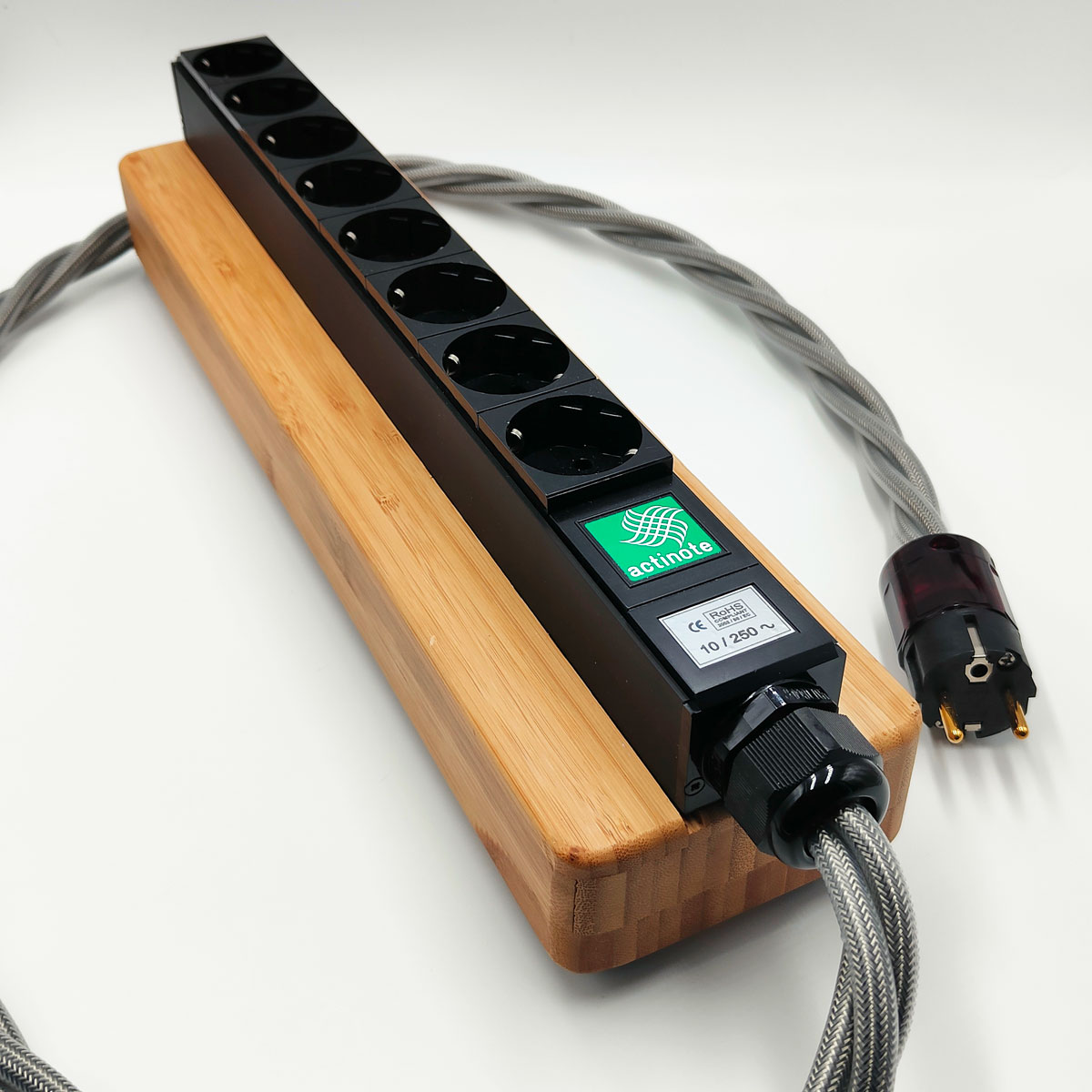 La barrette secteur est démontée et fixée sur un socle de bambou qui permet un écoulement maximum des vibrations. A l’écoute, le gain est significatif.